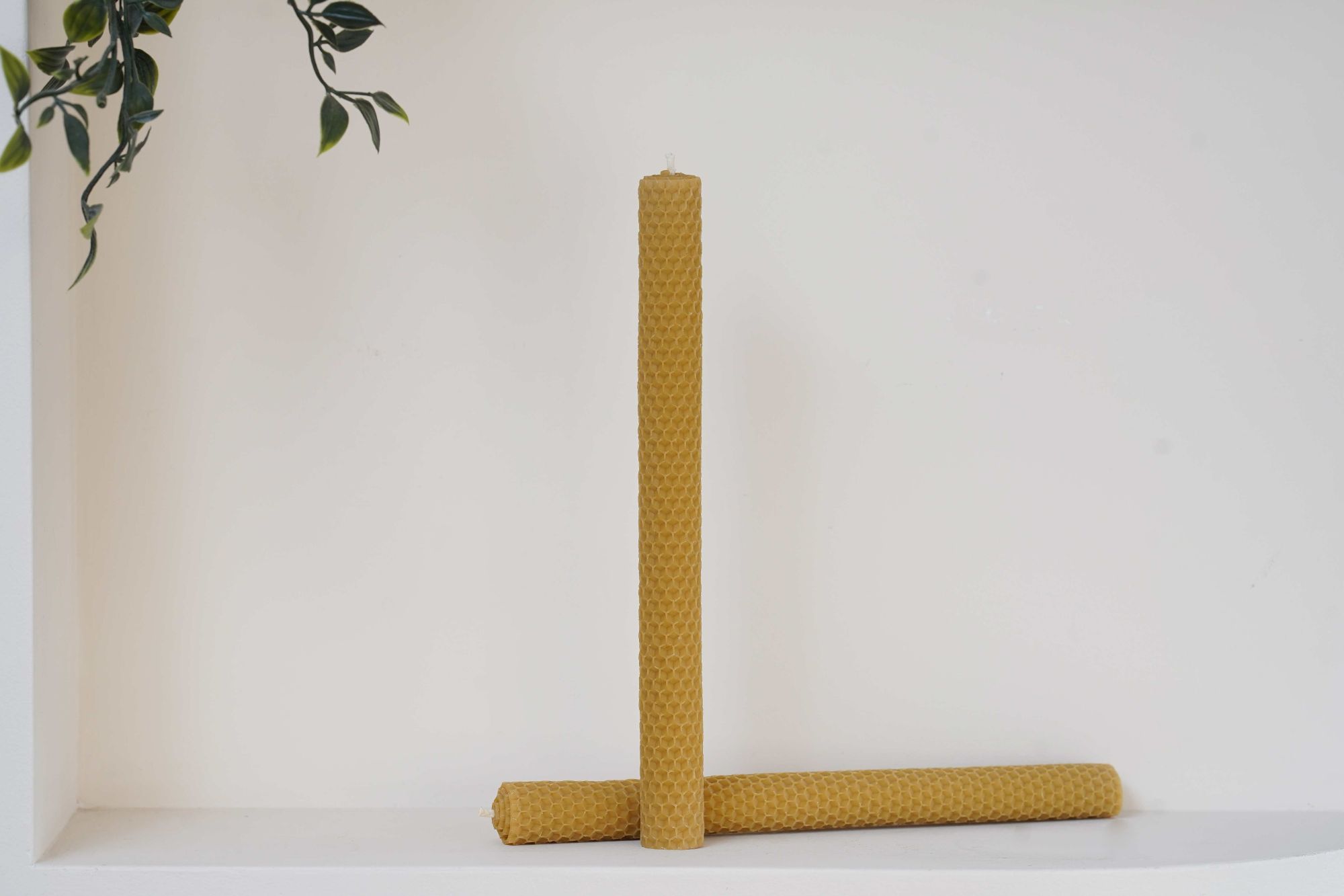 U pamučni fitilj pažljivo se urola satna osnova pčelinjeg voska, čime se dobija prepoznatljiva reljefasta tekstura saća, koja svedoči o prirodnom poreklu materijala i ručnoj izradi. Dug i tanak oblik sveće daje joj profinjenu siluetu i čini je savršenim dekorativnim elementom za svečane i mirne trenutke.